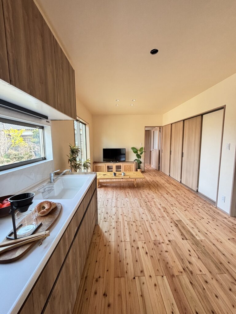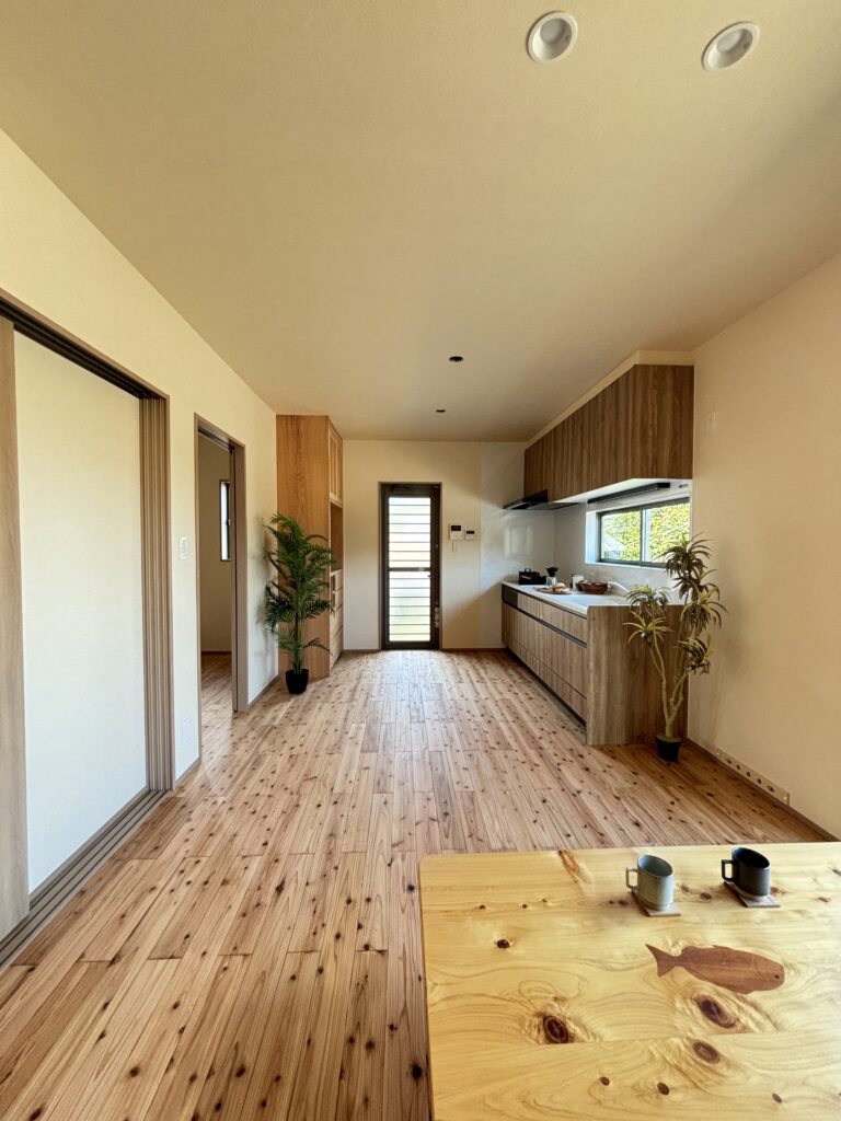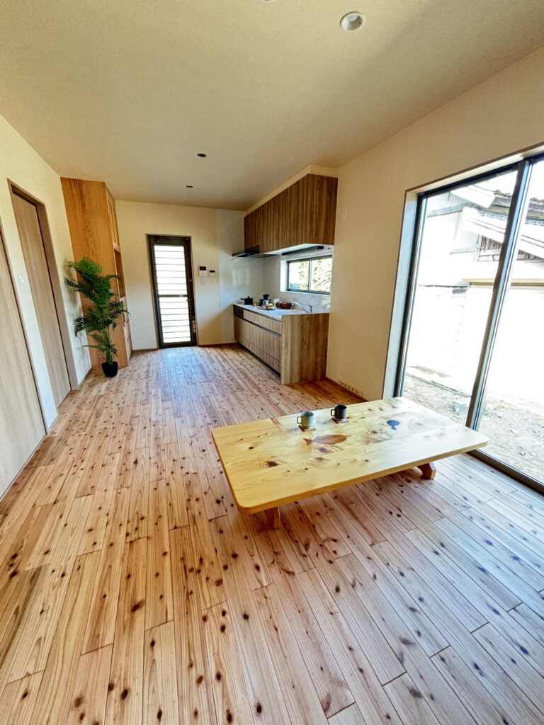 リビングに足を踏み入れた瞬間、広がるのは無垢の杉床の質感。冬でも冷たくなく、歩くたびに心がほどけるような柔らかさです。
